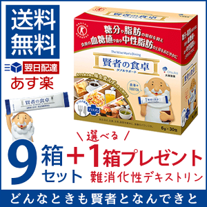 賢者の食卓9箱セットをお買い上げの方に当店オリジナル「なんできコラーゲンα」or「なんでき酵素」を1箱プレゼントしています! 脂肪だけでなく糖分の吸収も抑える、史上初のダブル特保。
